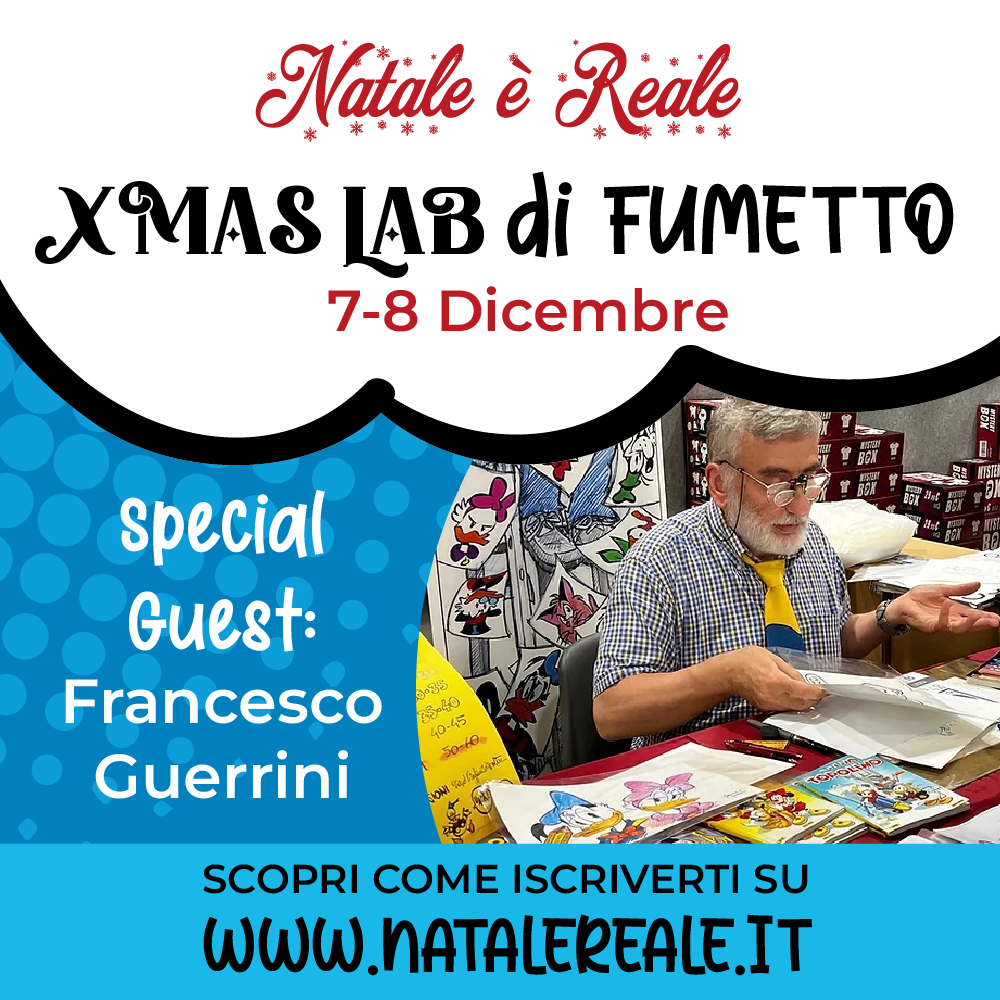 • Xmas  Lab di Fumetto Durata 1 h circa  .  Una bellissima esperienza immersiva indirizzato ai ragazzi 6 – 12 anni.  Si imparerà a disegnare un personaggio di fumetto, spiegando la finalità del RACCONTO DISEGNATO. Come partecipare? Dopo aver acquistato il biglietto di ingresso alla manifestazione, entro il 25 novembre, scrivi a info@natalereale.it  NOME COGNOME BIMBO –  ETA  –  GIORNO scelto per il laboratorio.
